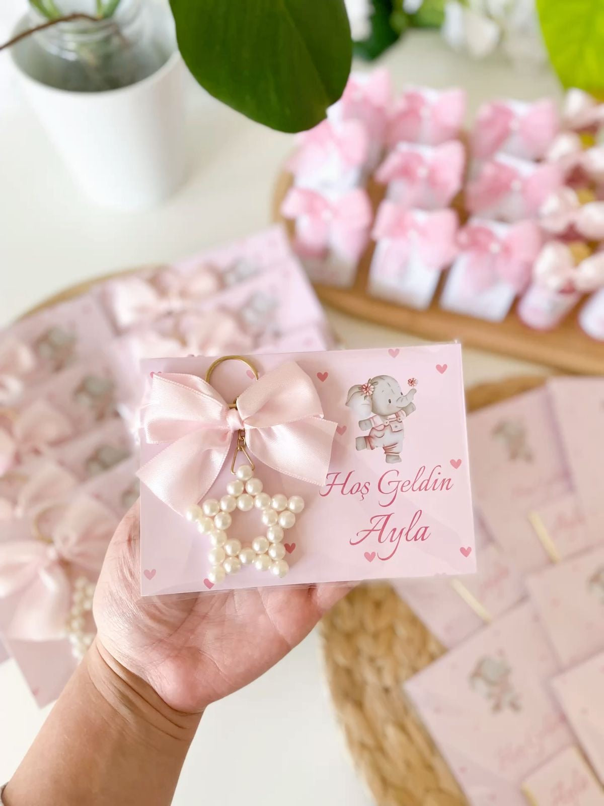 İnci detaylı bu zarif yıldız anahtarlık, baby shower, cinsiyet partisi, bebek mevlüdü, doğum günü gibi özel günler için hazırlanmıştır. Üzerine isim yazılabilir kişiselleştirme kartı, saten kurdele süslemesi ve şık tasarımı ile hem şık bir sunum hem de unutulmaz bir anı sunar.